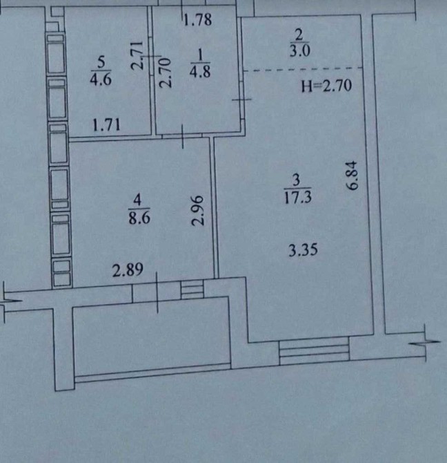 Общая площадь – 40 кв.м, просторная комната – 17.3 кв.м кухня – 8.6 кв.м с выходом на балкон, сан узел совместный, высота потолка 2.7м.