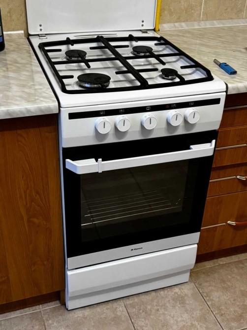 Кухня: вбудовані меблі, плита, духовка, витяжка, холодильник.
