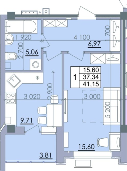 Загальна площа — 41.2 м², без несучої стіни