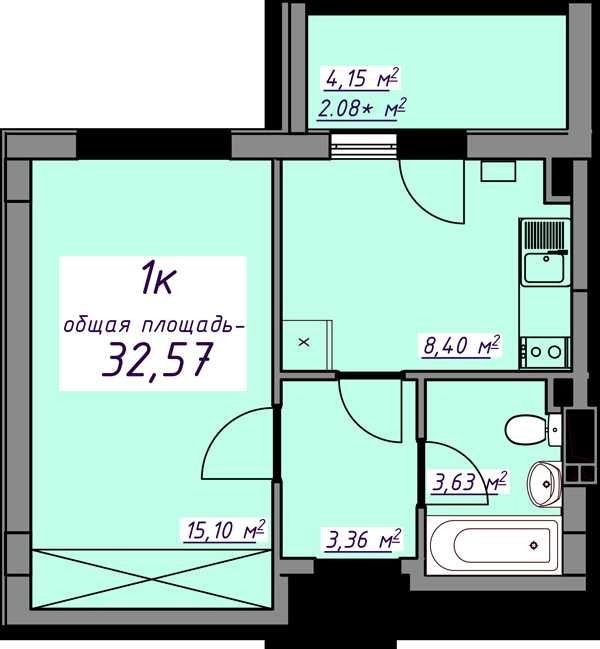 • Общая площадь 33.57 м2