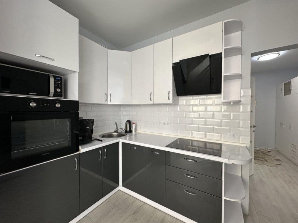 Кухня обладнана всім необхідним: холодильник, духова шафа, варильна панель, витяжка, мікрохвильова піч, стіл зі стільцями та додатковий диван.