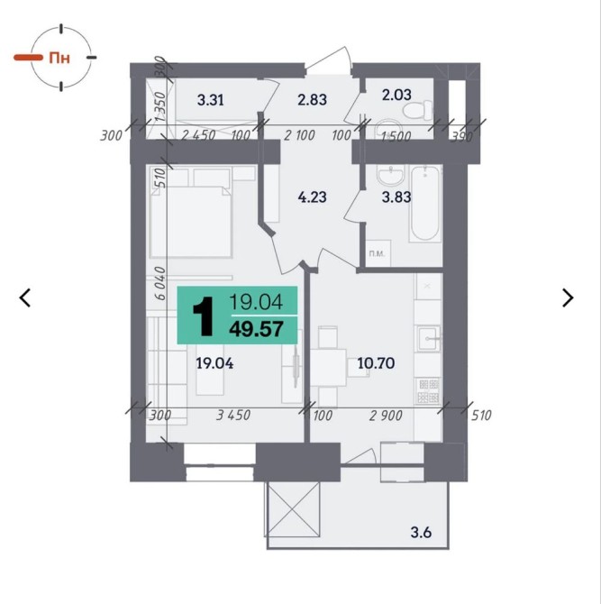 • Общая площадь 51.5 м2