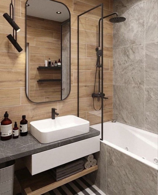 Ванная комната: Современная сантехника, стиральная машина, бойлер, фен, гигиенические принадлежности.