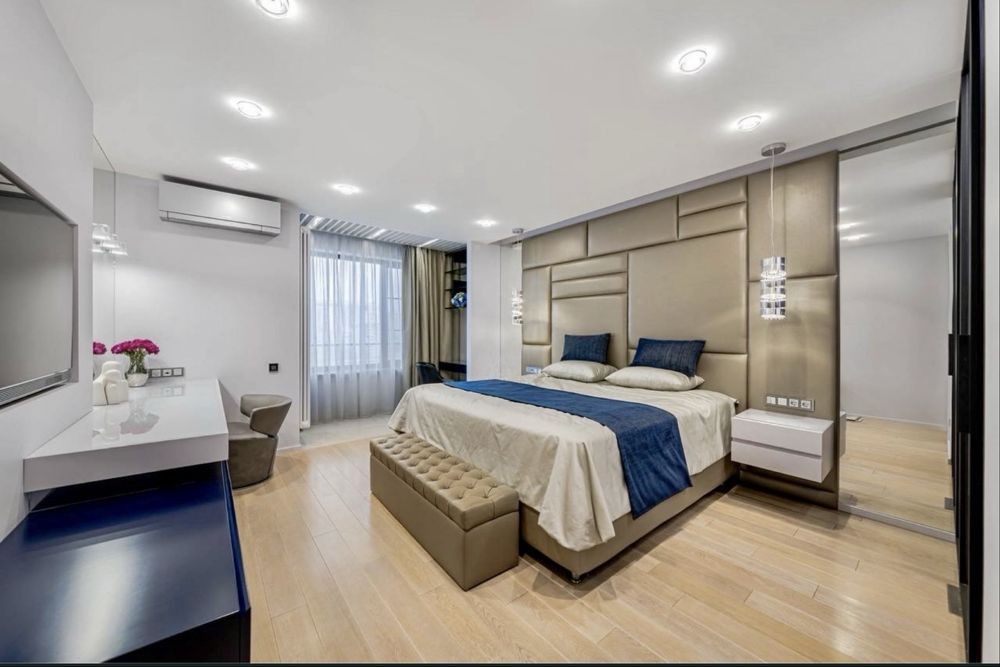 Спальня: Большая двуспальная кровать с ортопедическим матрасом, качественный текстиль.